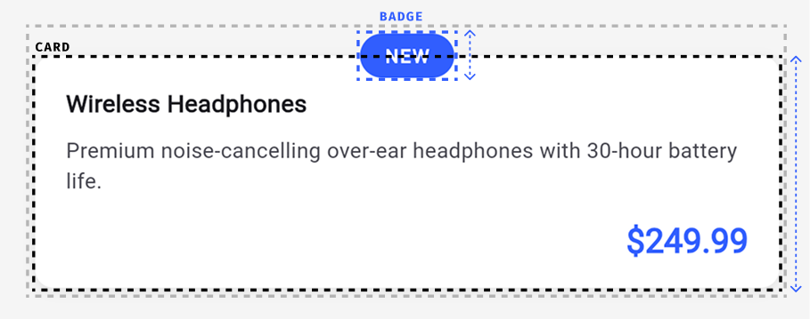 Let's build a concrete example: a card with an overlapping edge tag — the kind of component you'd see on a product card ("NEW", "SALE", "PRO") or a notification badge that straddles the top edge.